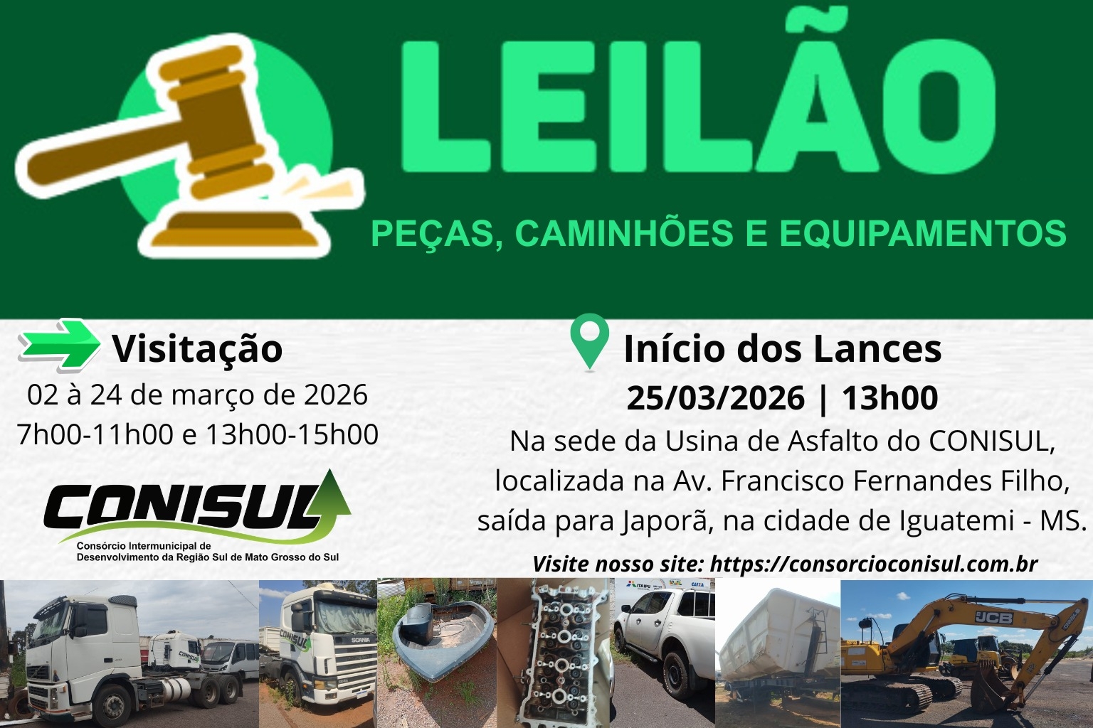 A visitação aos lotes estará aberta no período de 02 a 24 de março de 2026, nos horários das 7h às 11h e das 13h às 15h. Os interessados poderão conferir os bens presencialmente na Usina de Asfalto do Conisul, localizada na Avenida Francisco Fernandes Filho, saída para Japorã, em Iguatemi.